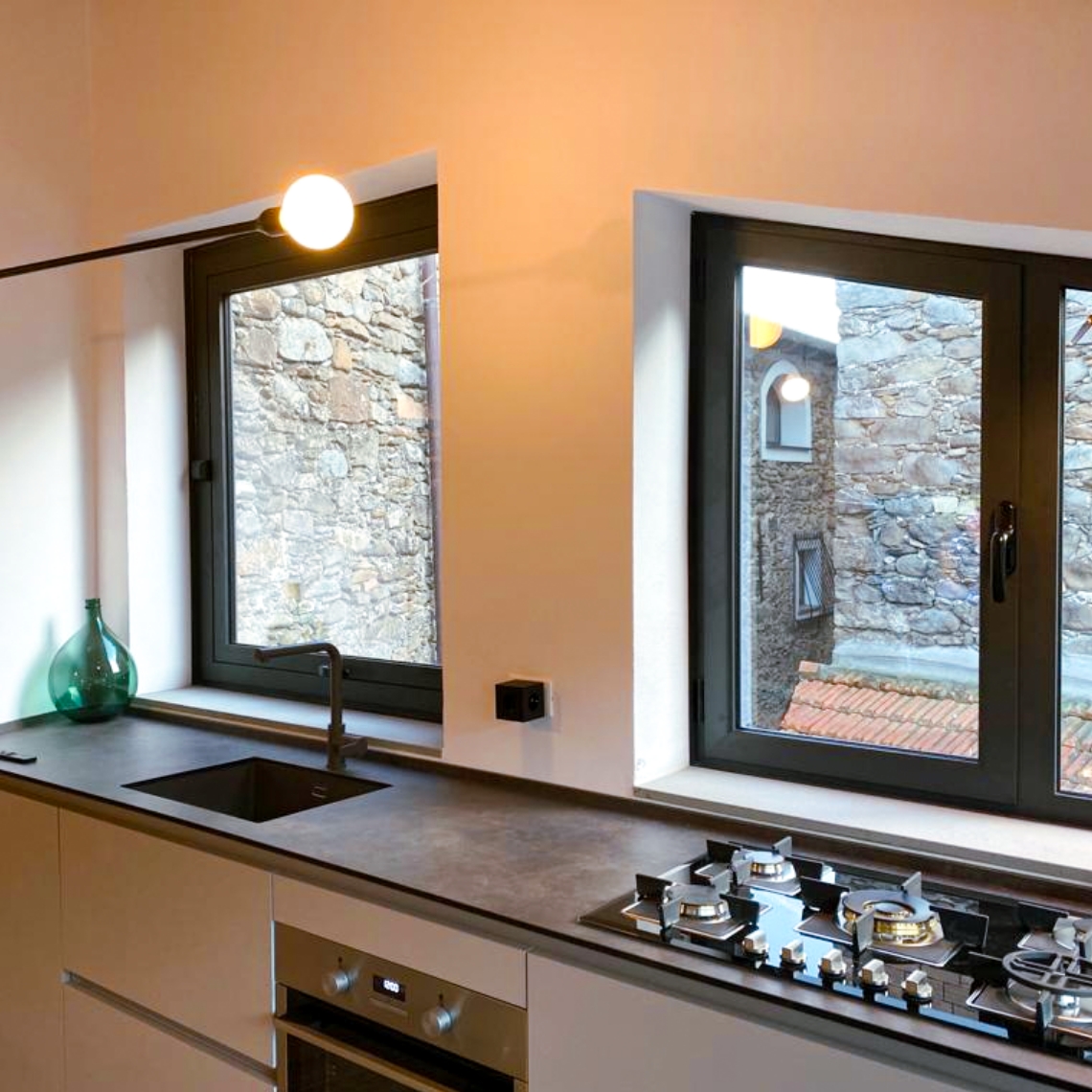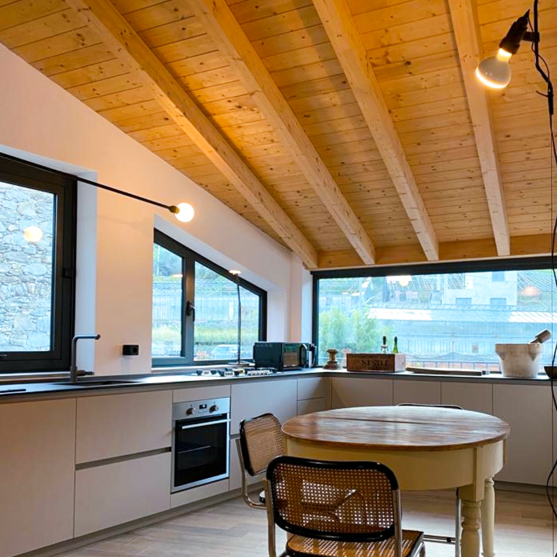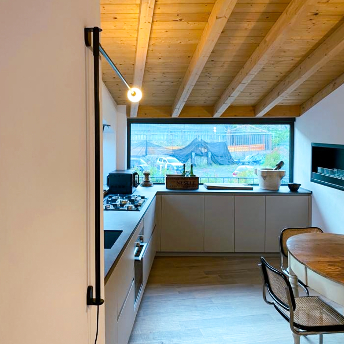Sulla base di queste premesse abbiamo iniziato partendo dalla cucina, che ha rappresentato di per sé una bella sfida essendo di dimensioni piuttosto ridotte e con un tetto a vista, altrimenti detto soffitto mansardato.