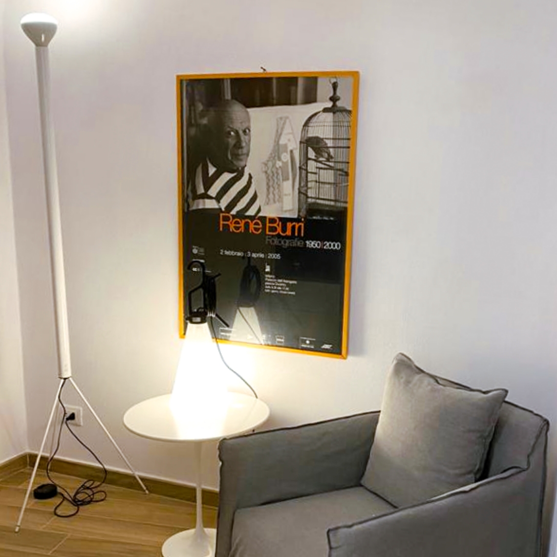 Per dare un tocco di carattere alla stanza ci siamo ancora una volta affidati ad illuminazione dal taglio eccentrico e innovativo, optando per una lampada da terra Flos e una da appendere, sempre by Flos.