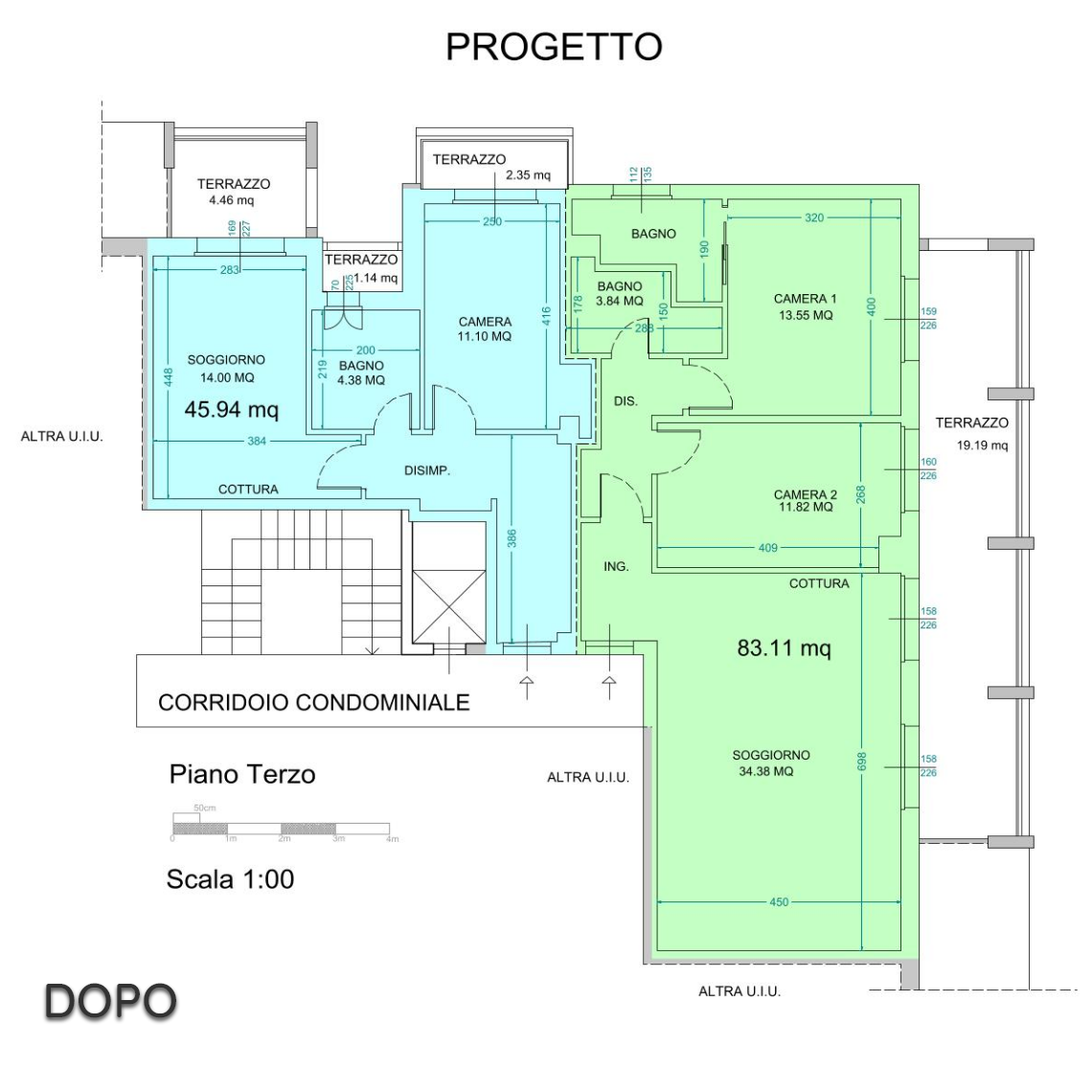 Uno degli aspetti più complessi da risolvere è stato quello di ritagliare due ingressi separati dal ballatoio condominiale, il tutto mantenendo una distribuzione interna che non sacrificasse il comfort e la luminosità degli ambienti.