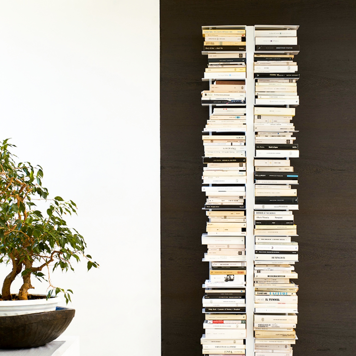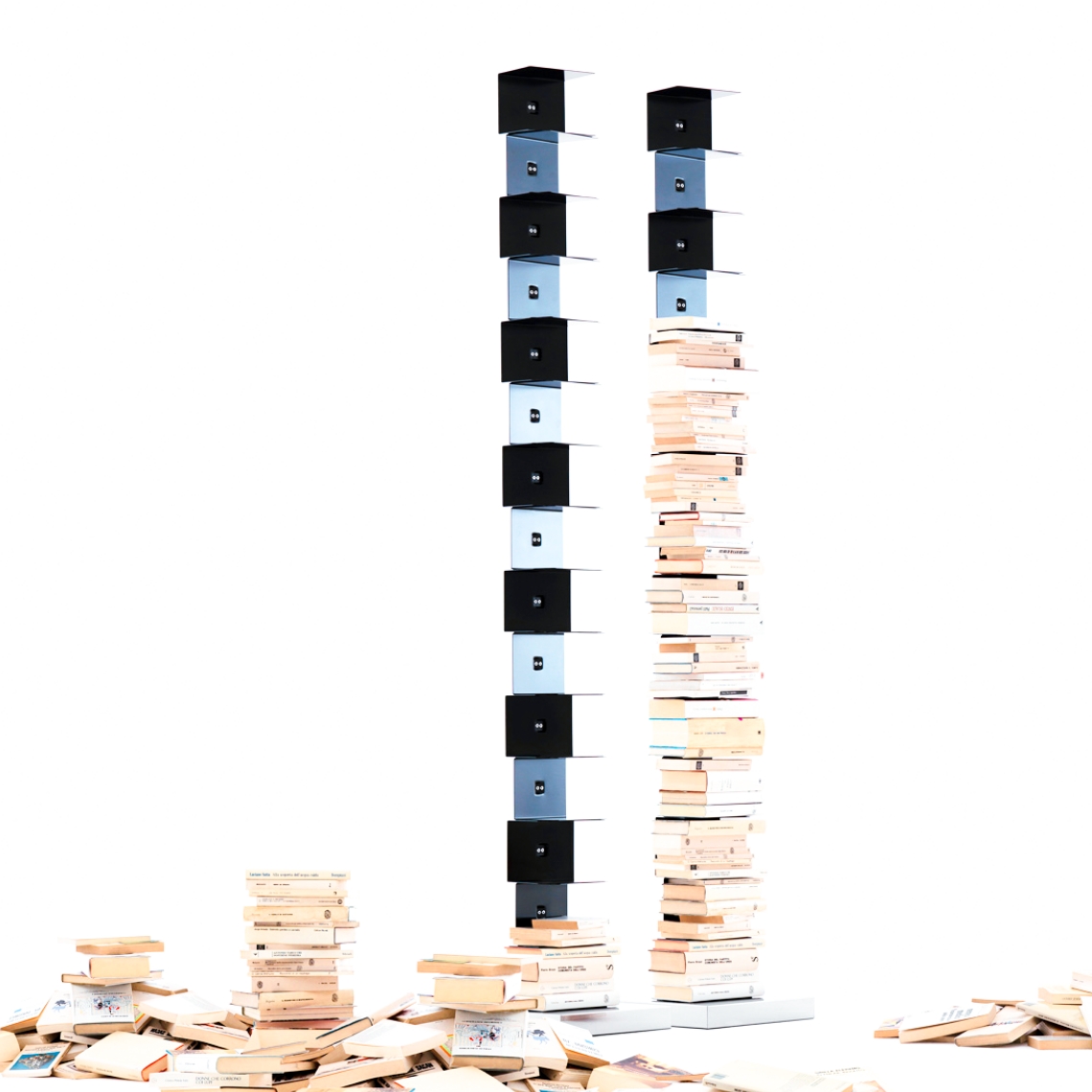 Ptolomeo X2: Questa variante di Original Ptolomeo è caratterizzata da una "sdoppiamento", con una doppia fila di ripiani specchiati. L'effetto visivo è unico, con una colonna centrale che separa due alte pile di libri, alte quasi 2 metri. La struttura autoportante in metallo laccato è disponibile in bianco lucido o nero opaco, con base in acciaio inox lucido.