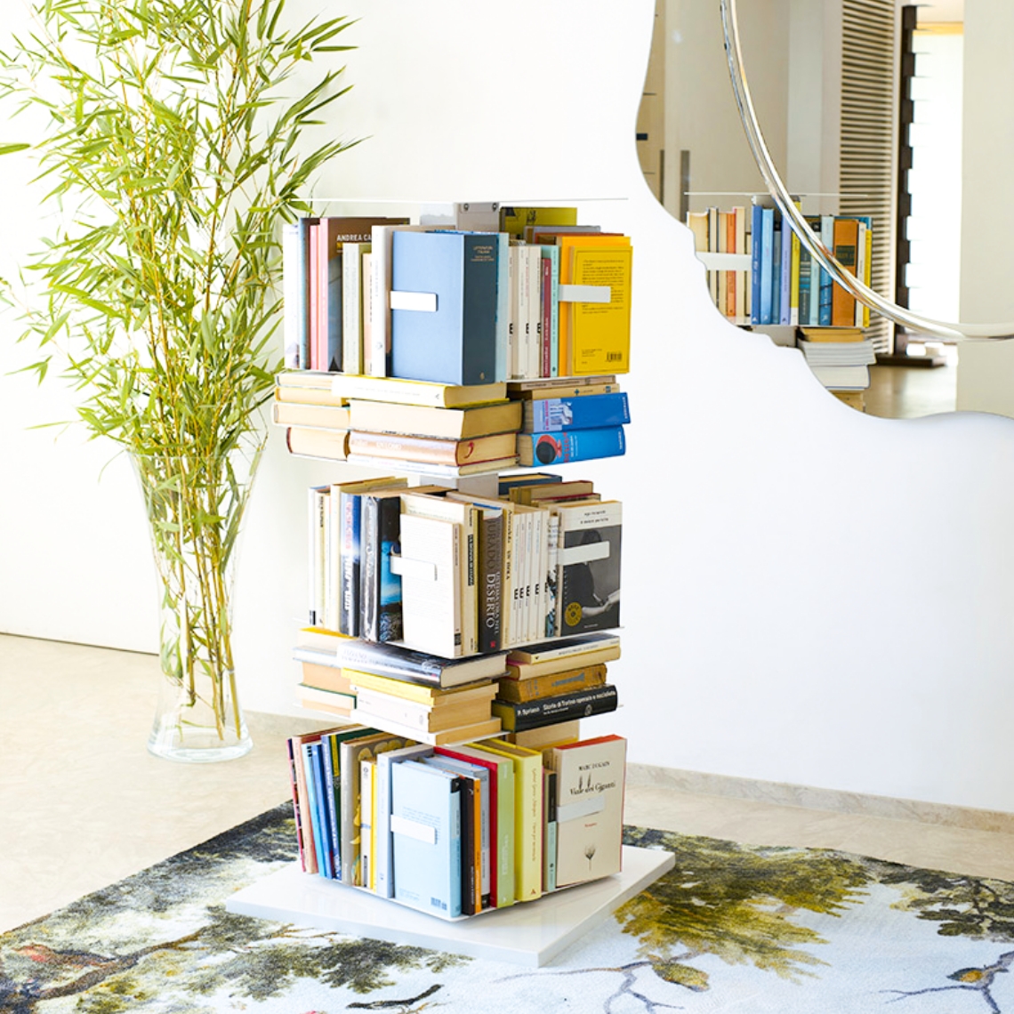 Ptolomeo X4: Questa variante è la versione girevole a 360° di Original Ptolomeo, progettata per gli amanti dei libri, dell'ordine e del design. La libreria è caratterizzata da una colonna centrale da cui partono ripiani quadrati, dai 3 ai 14 a seconda dell'altezza e della tipologia. Questa soluzione elegante e non ingombrante è disponibile in due altezze e offre una varietà di opzioni di sistemazione interna. Può contenere libri disposti sia orizzontalmente che verticalmente, creando un effetto patchwork suggestivo; è disponibile anche nella versione mini Ptolomeo X4 short.
