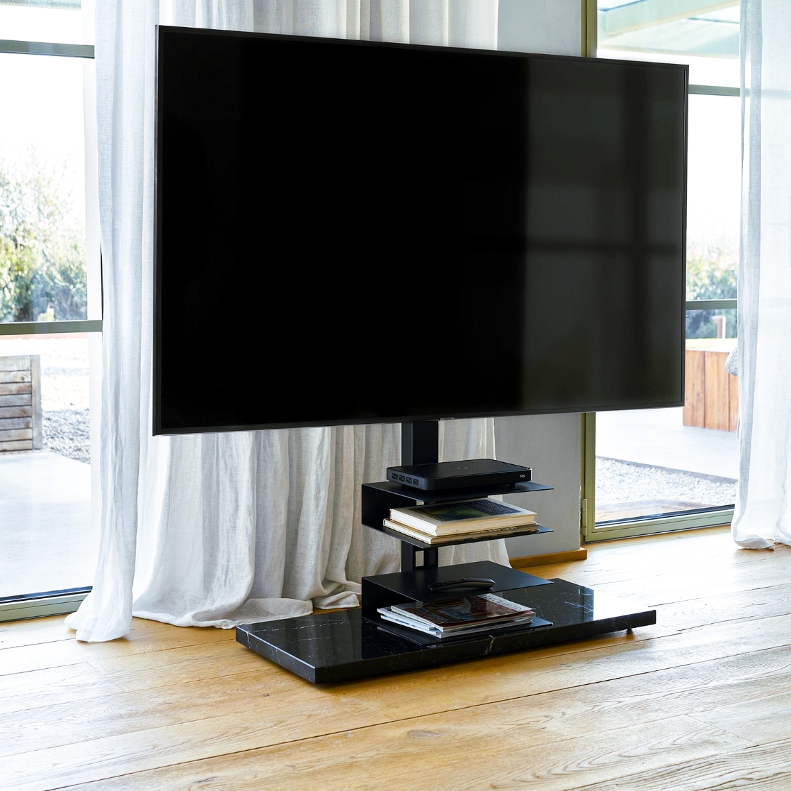 Terminiamo con l'evoluzione essenziale, leggera e funzionale di Ptolomeo TV Light, il sostegno multimediale che si adatta alle dimensioni sempre crescenti delle moderne televisioni. La struttura di base rimane intatta, una colonna elegante con mensole in acciaio progettate per ospitare le periferiche più comuni, ma con un incremento nei volumi per garantire stabilità anche con le nuove dimensioni e pesi delle ultime generazioni di televisori.