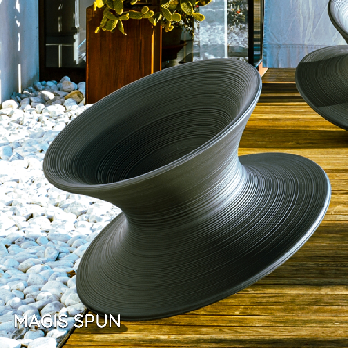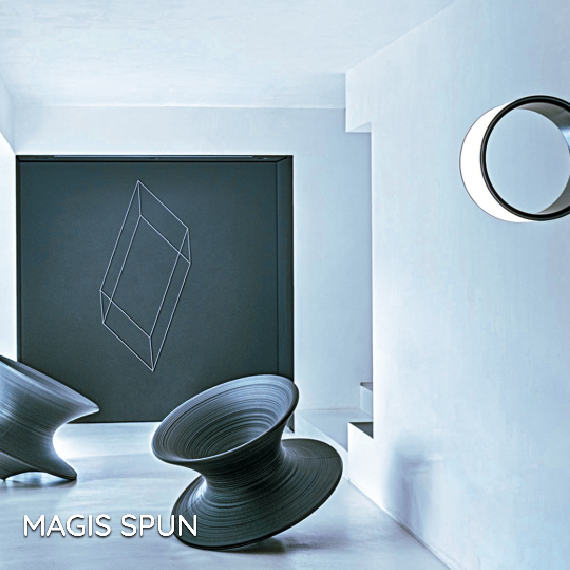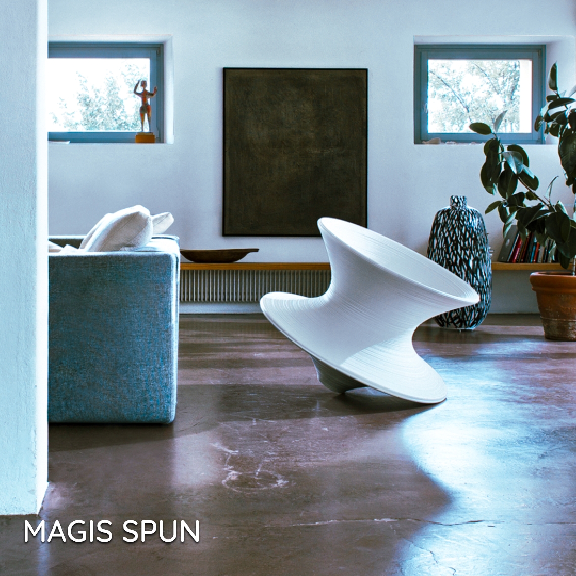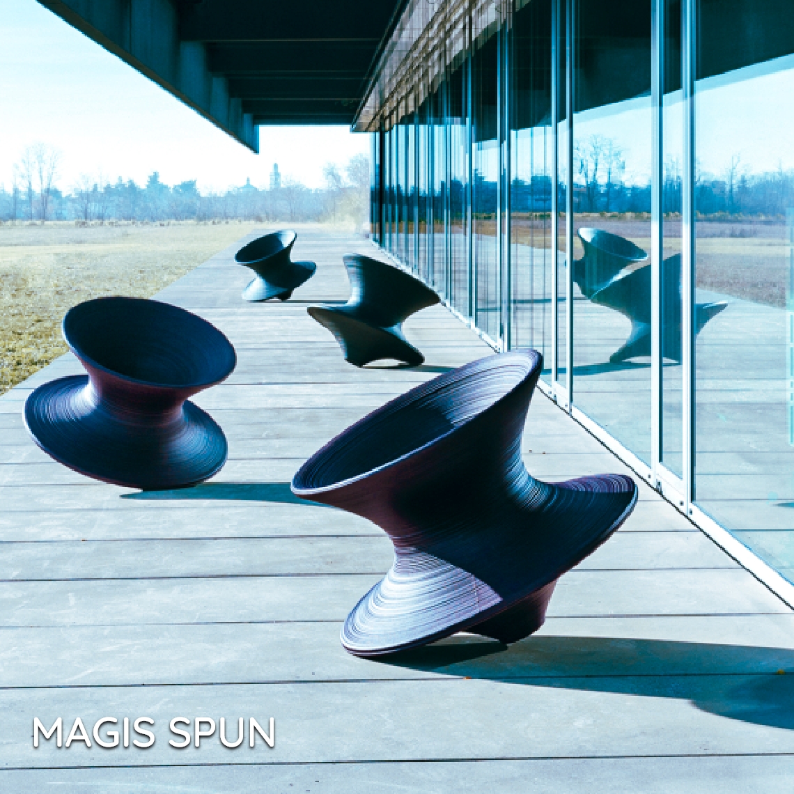 Un'altra rivoluzione degli anni 2010 arriva da Magis con Spun, disegnata da Thomas Heatherwick nel 2010. Questa poltroncina roteante in polietilene rappresenta una nuova concezione di seduta, combinando funzionalità e giocosità.
