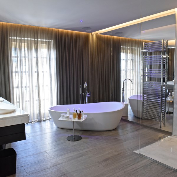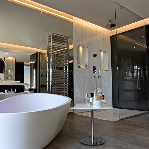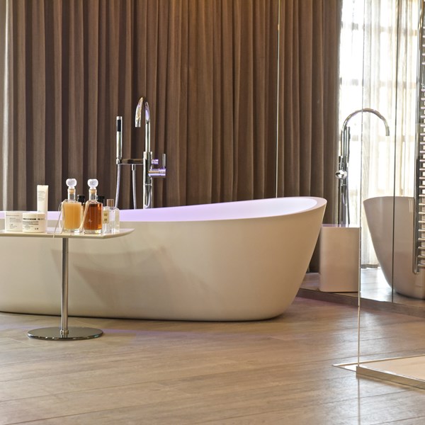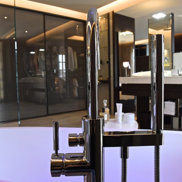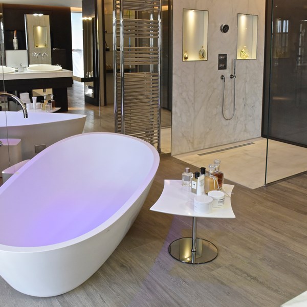 Essences de bois foncées et claires contrastées, reliées par une robinetterie couleur bronze. Baignoire sur pieds en Corian blanc.