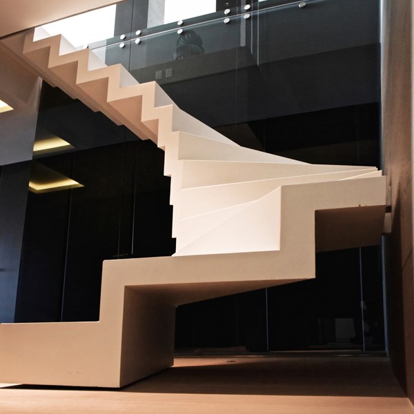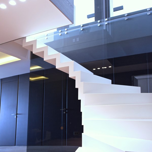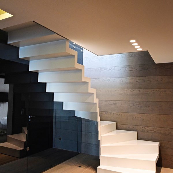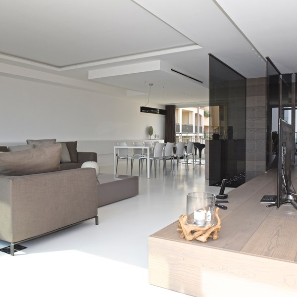 Style minimal pour les cloisons en verre fumé, l'escalier et le sol en résine blanche, et les boiseries en chêne gris fabriquées sur mesure.