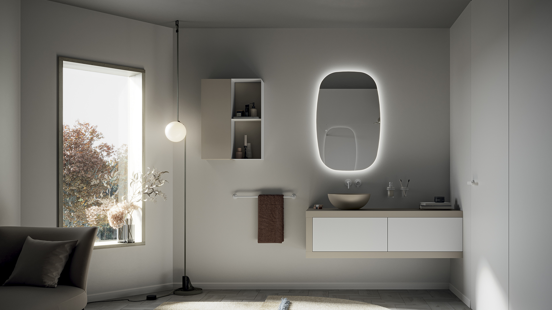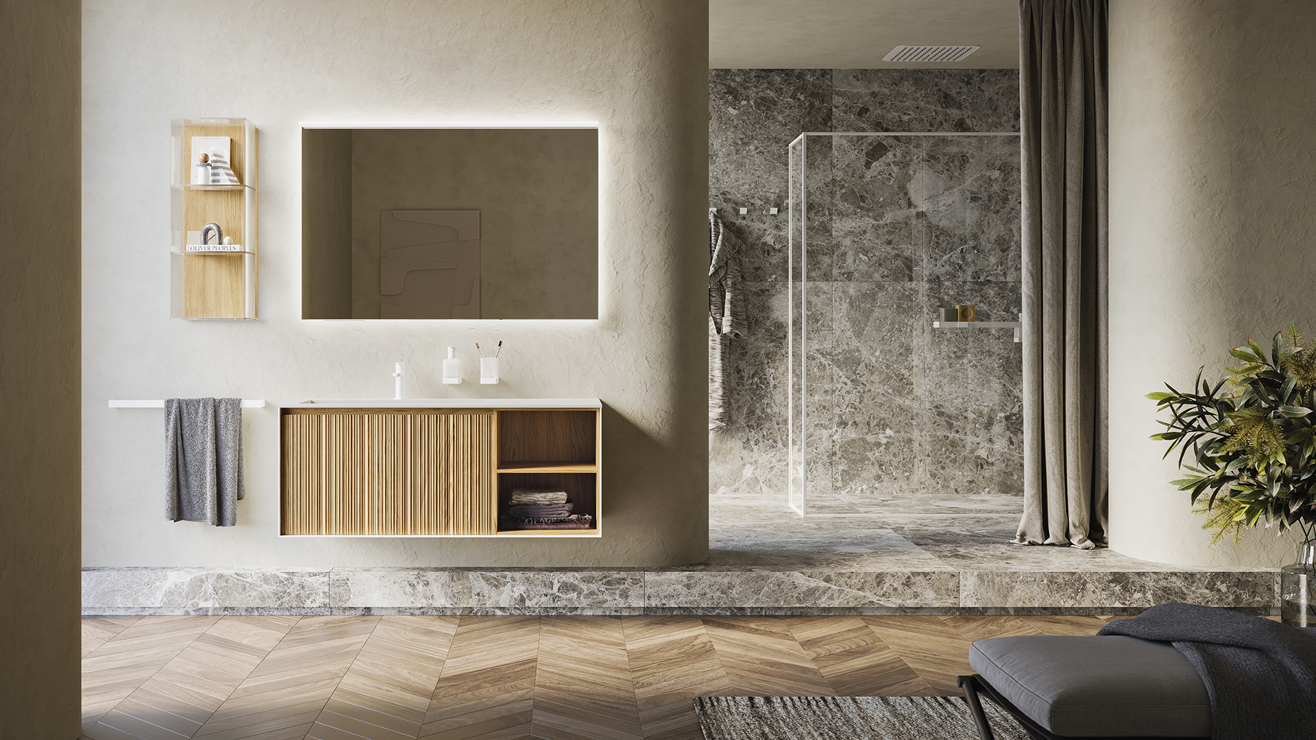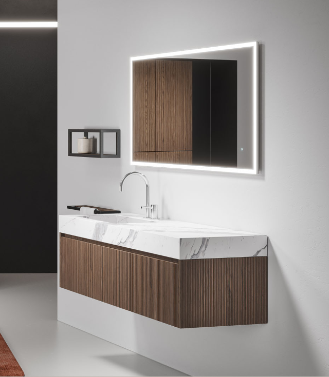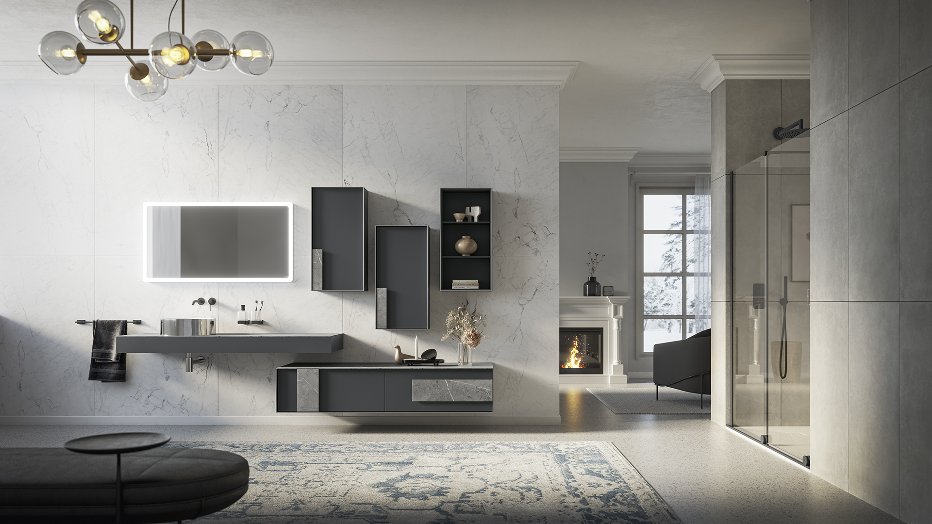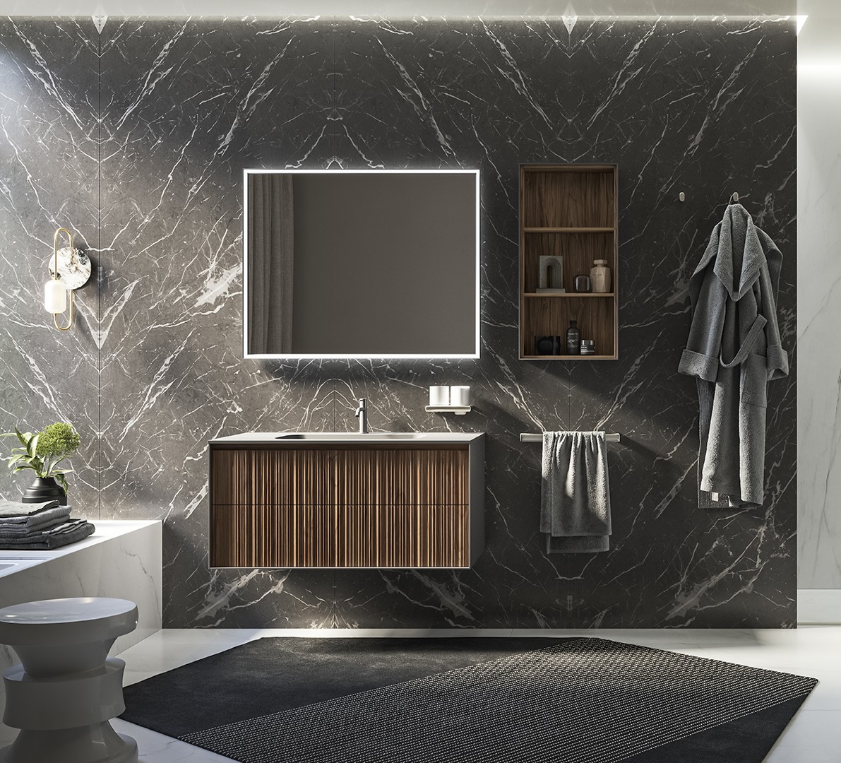 Brand per l'ambiente bagno che, attraverso l'accostamento di materiali e di cromie suggestive, seguono, in ogni dettaglio, le ispirazioni della casa e di chi la abita.